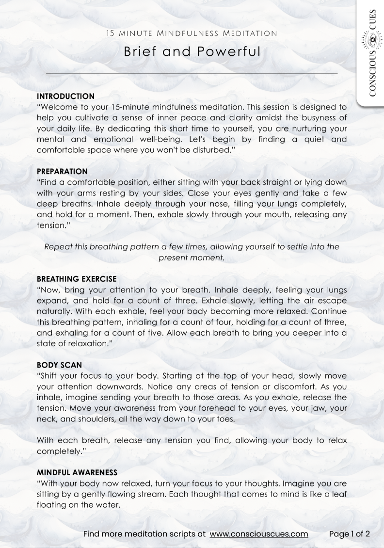 Download the 15-Minute Mindfulness meditation script. A foundational guide designed to ground your awareness, reduce mental noise, and cultivate a state of calm, non-judgmental presence.
